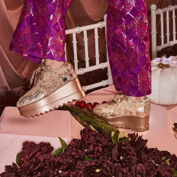 For the bride who wants to dance—not tiptoe. These gold-rust wedge sneakers mix couture detail with cool-girl ease, slipping as easily under a gown as they do with a post-wedding look. Comfort never looked so luxe.