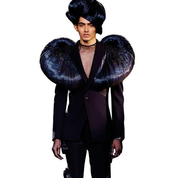 This inner world—of memories, of emotional sediment, of private tectonic shifts—is the engine behind this couturier’s work. It’s the reason his clothes feel alive; why they appear like creatures swallowing themselves whole; and why no two pieces, even when sculpted from similar ribbed polymers or repurposed Banarasi textiles, carry the same emotional weight.