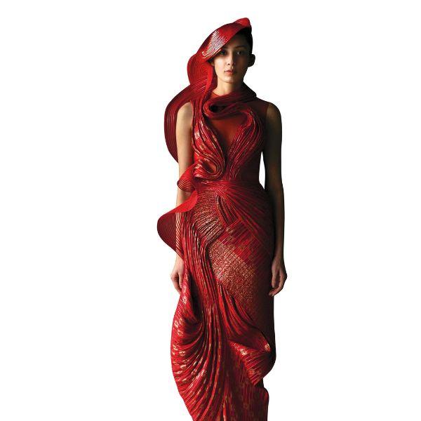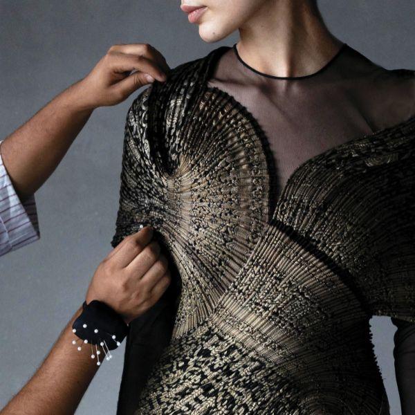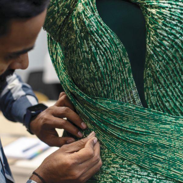 And contrary to the notion that Amit’s work is inherently futuristic, each garment is anchored in something far older. His woven polymer strands echo Victorian fluting. His engineered pleats borrow from age-old stiffening techniques once used for nobility. His revival of pre-owned Banarasi textiles—taboo in Indian bridal culture until he placed them unapologetically on the couture runway—is a reclamation of lineage, not a departure from it.