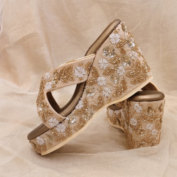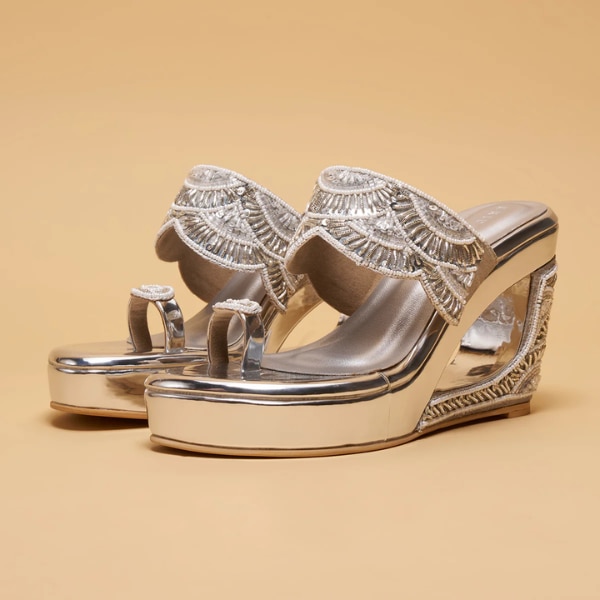 If there’s one wedding-day essential that deserves as much thought as the outfit itself, it’s the shoes. Especially when the celebrations stretch from a high-energy sangeet to post-midnight dancing, comfort becomes just as important as style. Enter embellished wedges, the unsung heroes of bridal footwear. Offering the perfect balance of height and support, they lend just enough lift while keeping you grounded through every step, twirl, and dance move. Equal parts accessory and essential, these statement wedges add a touch of glamour without compromising on ease, making them a failsafe choice for brides who want to stay chic well into the wee hours of the morning.