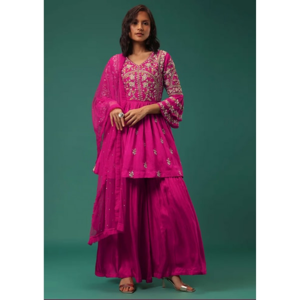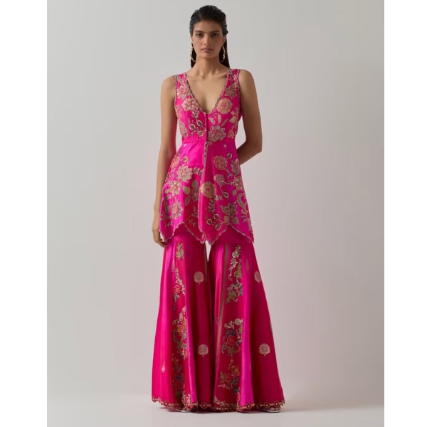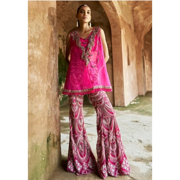 There’s something undeniably magical about Rani pink—it’s bold without being overpowering, festive without trying too hard, and timeless in every sense. When paired with intricate embroidery and the fluid charm of a sharara silhouette, the result is wedding-season perfection. Whether you’re the bride’s best friend, a bridesmaid on duty, or simply living your best wedding-guest life, a Rani pink embroidered sharara is that one outfit you can rely on to make a statement while staying rooted in tradition. The perfect twirl-worthy volumes, exquisite detailing, and a colour that flatters across day and night celebrations.