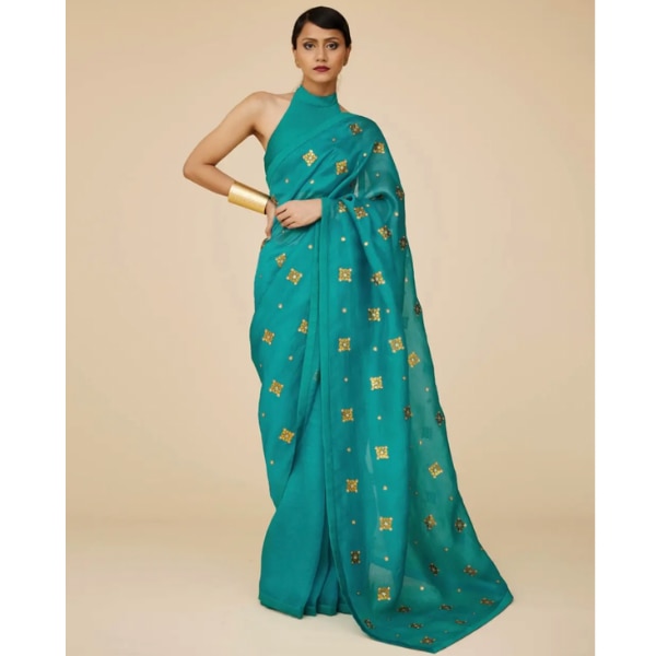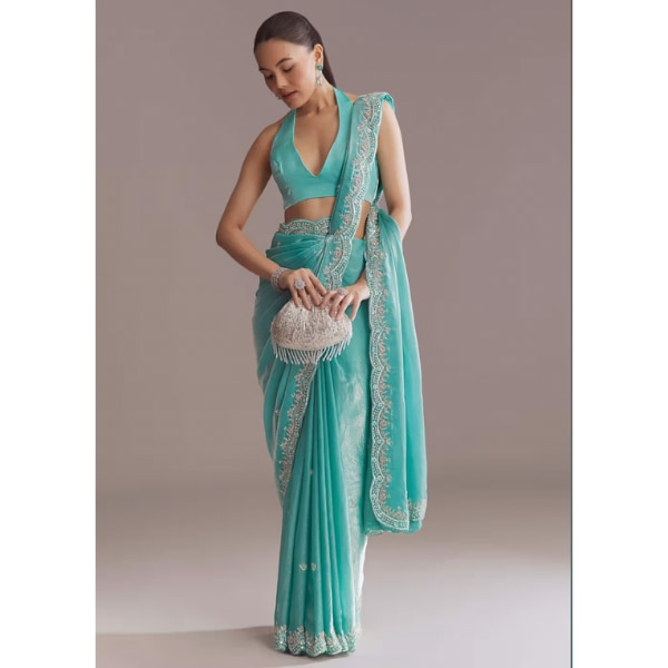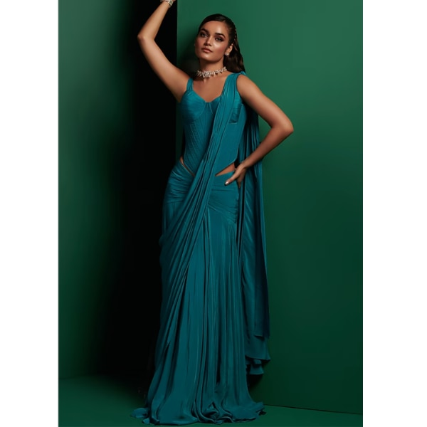 Teal sarees, in particular, have emerged as a favourite for everything from sangeets to cocktail evenings. The colour’s jewel-like depth pairs beautifully with metallic embroidery, intricate zari work, and contemporary silhouettes, creating a look that feels festive yet sophisticated. It also photographs well, catching light in a way that highlights both the fabric and the craftsmanship.