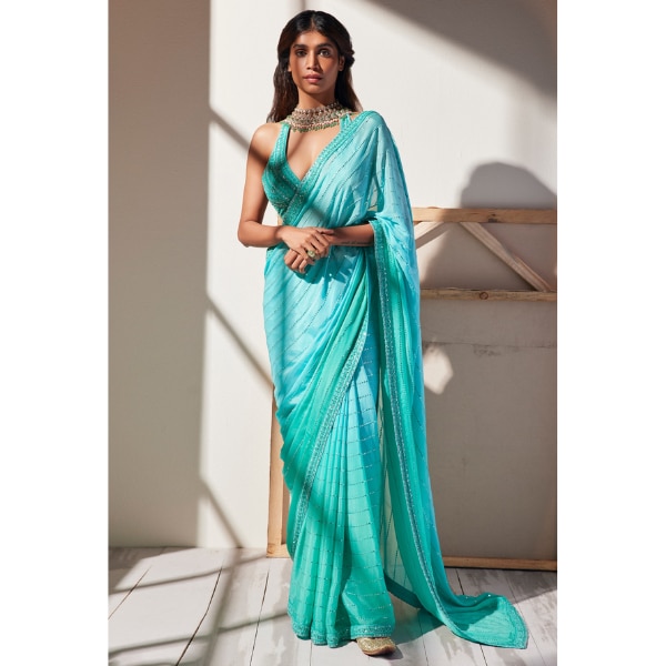 7. Jade By Ashima Blue Crepe, Georgette Cut Work Light Tiffany Pre-draped Saree and Blouse, ₹33,920