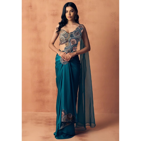 6. Label Moni K Teal Crepe, Satin, Organza Applique, Chakra Pre-draped Saree with Blouse, ₹24,000