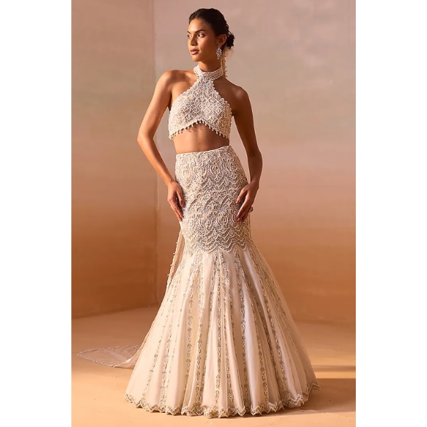 It wasn’t until the early 2000s that Indian designers began marrying these two worlds. Pioneers like Manish Malhotra and Tarun Tahiliani reimagined the traditional lehenga through the lens of the mermaid gown’s silhouette. The result was the mermaid lehenga—an ensemble that hugged the body through the hips and thighs before flaring dramatically below the knees. This design preserved the embellishment and cultural richness of the lehenga while offering brides a contemporary edge.
