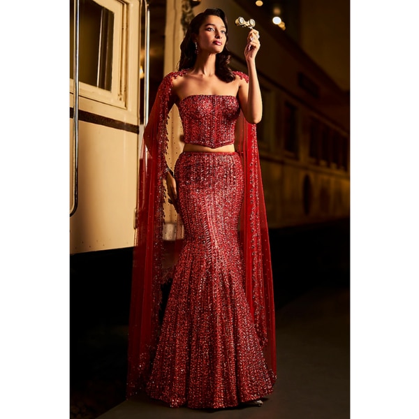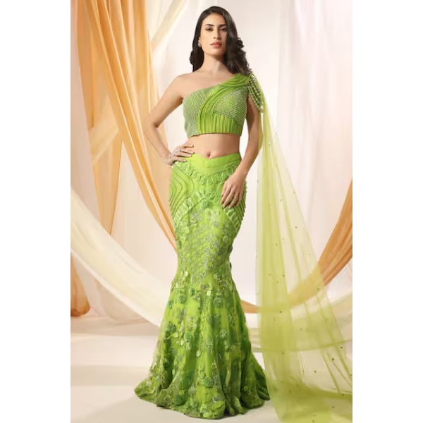 Now a bridal and runway staple, the mermaid lehenga has cemented its place as a symbol of heritage-meets-modernity. Often embellished with sequins, crystals, or traditional embroidery, it merges timeless craftsmanship with bold, sculptural drama. Designers experiment with add-ons like capes, tulle overlays, and customised blouses, ensuring the style continues to evolve while remaining faithful to its Mughal roots.