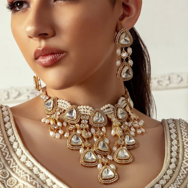 Every bridal trousseau needs one standout jewellery piece, and a polki necklace fits that role perfectly. Its uncut diamonds and traditional setting give it a regal charm that works with everything from lehengas to sarees. You can wear it on your wedding day, style it with lighter outfits later, or even pair it with fusion wear for festive dinners.