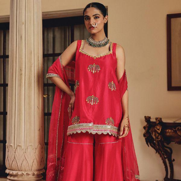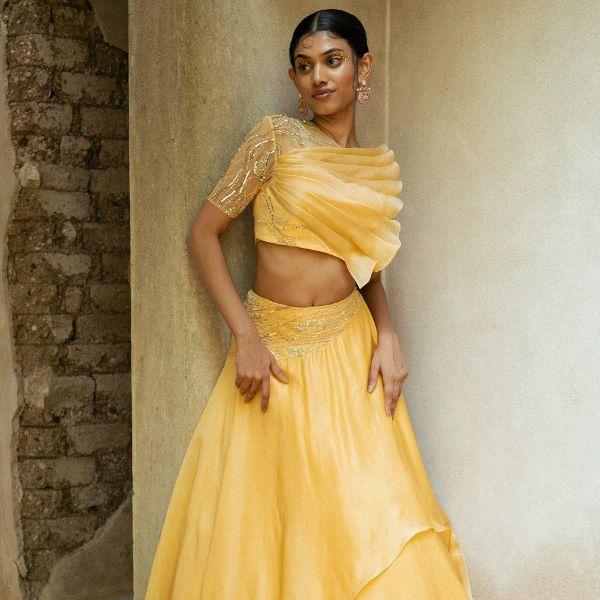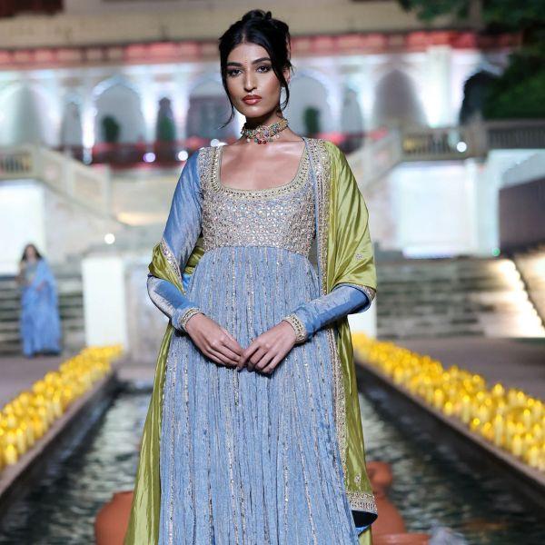 Ahead, we’ve put together a selection of festive wear encompassing all moods, from lehengas and sarees to shararas and anarkalis. Here, designers are translating these hues into silhouettes that feel both classic and contemporary, reminding us that fashion, like festivals, is as much about meaning as it is about beauty.