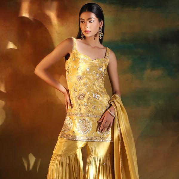 Meenagurnam Gold Tissue Embroidery Round Neck Kurta Sharara Set, ₹26,151