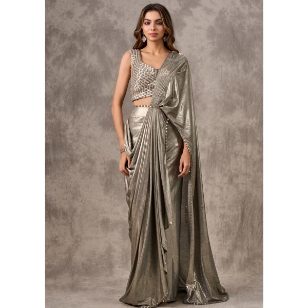 Puneet Kapoor is a go-to for the modern bridesmaid or wedding guest who prioritises ease and structure. His designs often feature "skirt-style" pre-draped sarees that eliminate the hassle of pleating while maintaining a high-fashion silhouette. The metallic blue dori work in his collection offers a rich, liquid-like sheen that feels youthful and energetic—perfect for a high-energy Sangeet or an outdoor destination ceremony.