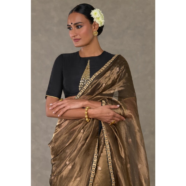 Beach Weddings: Lighter metallics like champagne tissue or pale gold organza complement sandy backdrops without competing with the natural setting. Pair with minimal jewellery and let the saree do the work.
