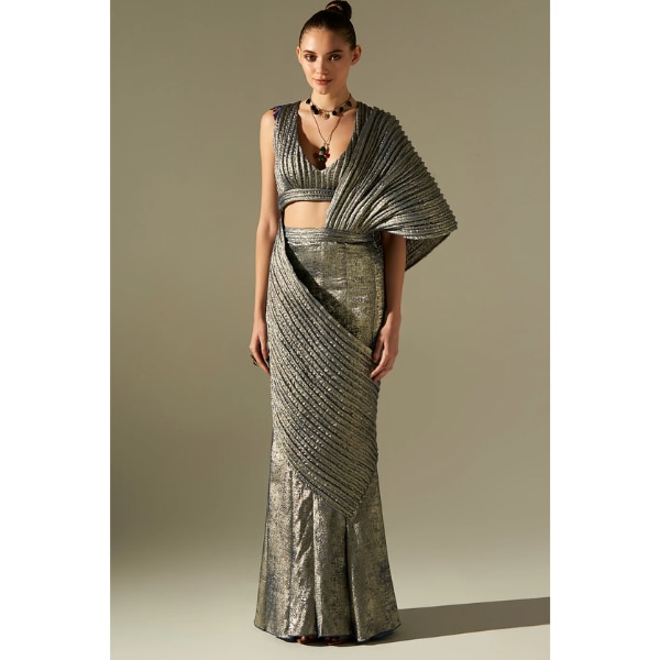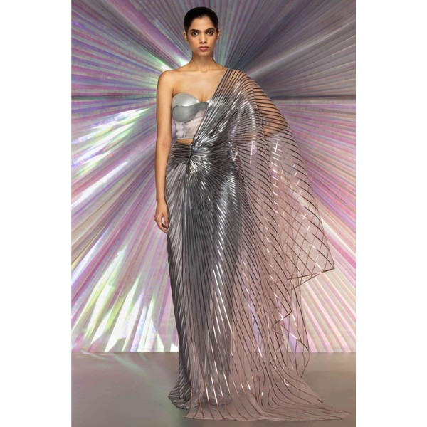 Widely considered the pioneer of engineered metallic fashion in India, Amit Aggarwal’s work is more wearable art than traditional clothing. He is known for using industrial materials, recycled polymers, and intricate metallic piping to create 3D structures. His metallic ombre sarees and moulded corsets are iconic, offering a futuristic, "galactic" glamour. If you want a show-stopping look for a Grand Reception, his architectural drapes are unparalleled.