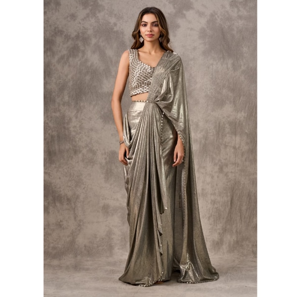 Known for their contemporary approach to traditional drapes, Twamev offers stunning metallic sarees that are perfect for destination weddings. The brand's Grey Soiree Elegance Saree exemplifies the kind of understated glamour that photographs beautifully across different settings—sophisticated enough for an evening reception yet versatile for various wedding events.