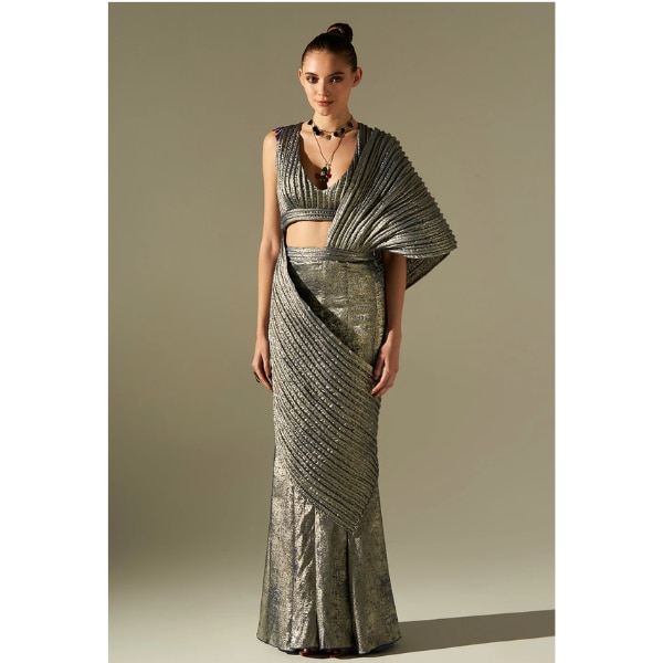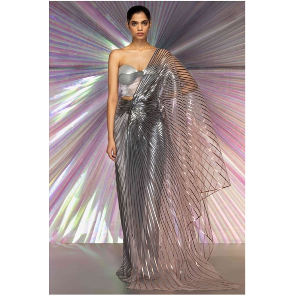 Widely considered the pioneer of engineered metallic fashion in India, Amit Aggarwal’s work is more wearable art than traditional clothing. He is famous for using industrial materials, recycled polymers, and intricate metallic piping to create 3D structures. His metallic ombre saris and molded corsets are iconic, offering a futuristic, "galactic" glamour. If you want a show-stopping look for a Grand Reception, his architectural drapes are unparalleled.