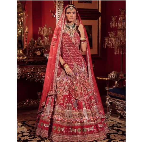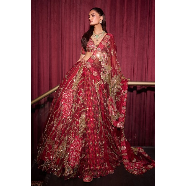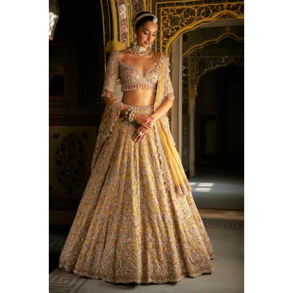 Today, zardozi remains a cornerstone of Indian bridal fashion, valued for its regal presence and intricate relief work. Its ability to transform silk, velvet and organza into luminous works of art makes it a natural choice for bridal lehengas, dupattas and couture ensembles. Designers such as Sabyasachi Mukherjee, Tarun Tahiliani, Anita Dongre, Manish Malhotra, Ritu Kumar, and Anushree Reddy continue to reinterpret the craft, blending Mughal grandeur with modern silhouettes and palettes. On the global stage, fashion houses including Marchesa, Elie Saab, Dior, Chanel, and Louis Vuitton have incorporated zardozi into their collections, reaffirming its timeless and universal appeal.
