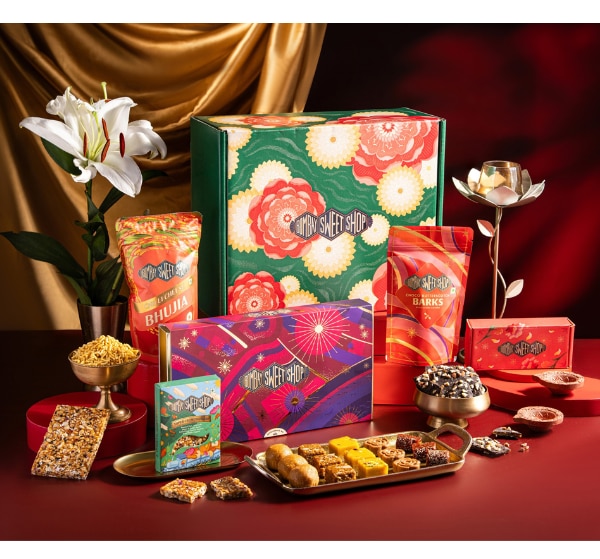Once again, Bombay Sweet Shop is giving Diwali gifting a playful twist with fun handcrafted mithai. Expect delights like nutty dodha barfi, hazelnut besan laddu, gulab saffron roll, and the cheeky Biscoff mathura peda. The specially curated hampers come loaded with festive extras—assorted nuts, chikkis, namkeen, artisanal diyas, and even a deck of playing cards. For chocolate lovers, there’s the three-layer fudge, coconut caramel patissa, and dark chocolate kaju katli, while savoury treats like tom yum makhana mix and chilli cheese bhujia balance the sweetness.