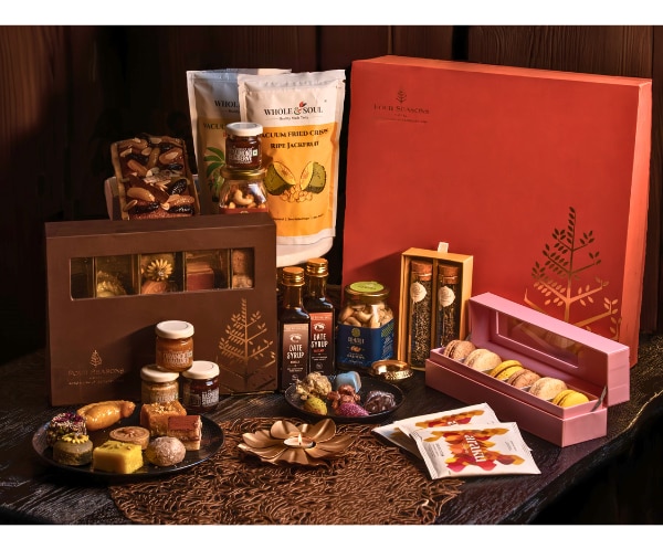 From Kindle’s festive classics like gujiya, hazelnut besan burfi, and nolen gur coconut kheer kadam to Glow’s artisanal chocolates, saffron travelling cake, and handcrafted diya, each hamper from Four Seasons is a curated celebration of flavour and light. Lustre and Aura take indulgence further with macarons, nut mixes, hand-rolled chocolates, and even wine, combining elegance, tradition, and festive joy in every gift.