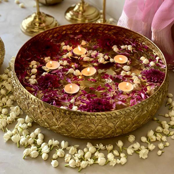 Scatter fragrant florals like jasmine, mogra, champa, and rose in your table décor.