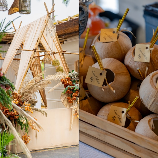 The next day began on a lighter note with a floral pastel mehendi lunch. Antique accents, muted tones, and cheerful floral installations set a romantic daytime mood. The highlight? A sugarcane and coconut juice counter that had everyone queuing up for a refreshing sip under the Thai sun.