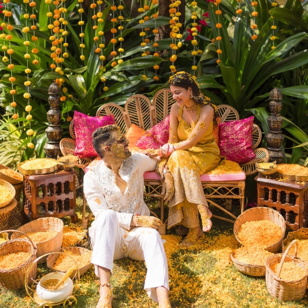 The celebrations then moved to Goa, where the mood shifted into something more relaxed and intimate. Held at Mercure Devaaya Resort, the mehendi was filled with colour, music and a warmth that reflected the couple’s dynamic. Surrounded by lush greenery and accompanied by live music, the afternoon felt unhurried and joyful, allowing guests to fully settle into the destination setting.
