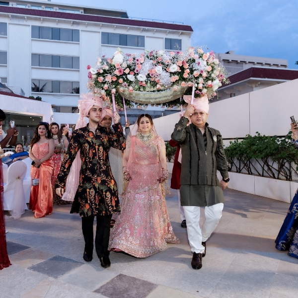 Hotel Sun-n-Sand offered everything Bathija had dreamed of—a sunset horizon, a gentle breeze, and waves close enough to hear during the vows. With 350–400 guests, the grand celebrations carried a sense of joy, familiarity, and effortless warmth.