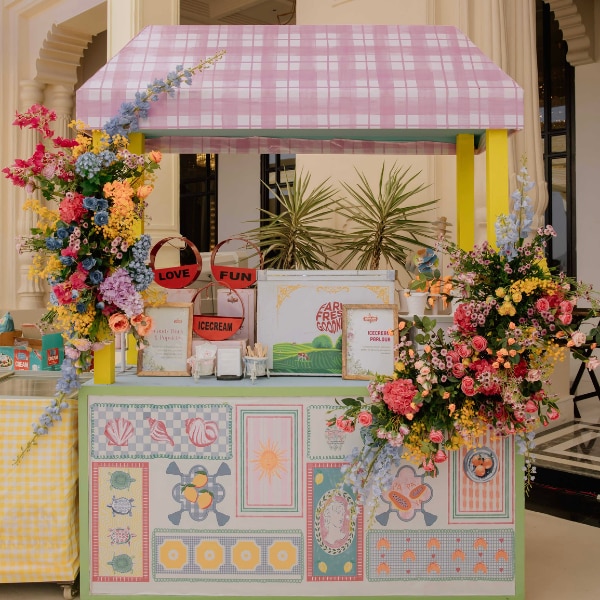 The next day, ‘C’est La Fête’ reimagined a European summer carnival through a modern, whimsical lens. Inspired by French artist Alexandre Benjamin Navet, the celebration was brought alive with colour-blocked pavilions, candy-striped drapery, gingham-wrapped bars, and floral carts reminiscent of Mediterranean café streets. The vibrant setting turned a daytime event into a painterly escape, offering guests an experience that was both playful and visually captivating.