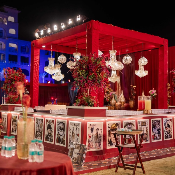 Each event during the wedding weekend was a standalone visual story, distinct in its global inspiration yet seamlessly woven into a cohesive narrative. The festivities opened with ‘Tribal Tango’, a sundowner that drew from Afro-Egyptian aesthetics with wild botanicals, sculptural totems, and garlands made of dried chillies and potatoes. Instead of conventional carpets, guests walked on soft sand, and handwritten postcards layered emotion onto the strikingly raw, textural setup, making the evening feel more like an immersive art installation than a typical wedding function.