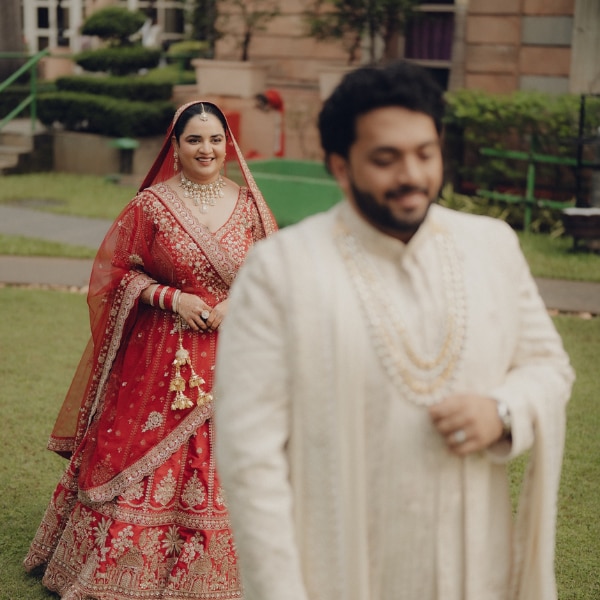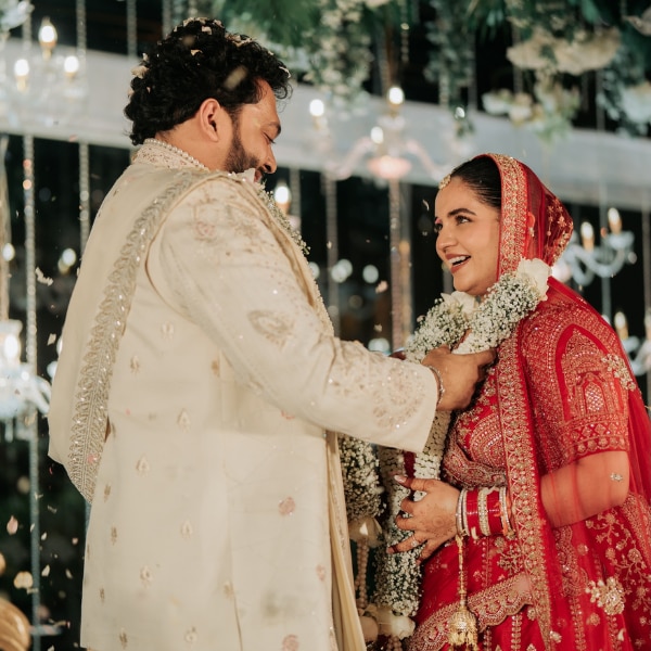 For the wedding, she embraced the timelessness of a red bridal lehenga—custom-made and exquisitely detailed with gold zari and thread embroidery. The deep crimson shade, representing love and new beginnings, carried an old-world charm, while the sheer, delicately bordered dupatta added a touch of modern grace. Her look balanced tradition and individuality with ease, embodying her signature approach to beauty—confident, honest, and unapologetically herself.