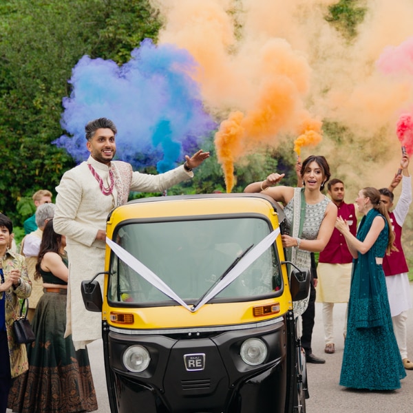 Rishi’s baraat brought Indian celebration to the English countryside. Dhols, Bollywood music, and dancing guests lit up the atmosphere, but the highlight was the groom's bright yellow auto rickshaw, his one special request.