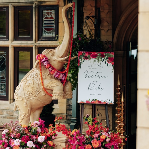 The decor was designed to balance two distinct sensibilities. Elements flown in from India, including fabrics, linens, and elephant statues, sat alongside locally sourced English florals. The mandap drew deeply from Indian traditions, while live classical music filled the space.