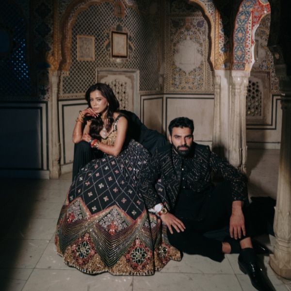 The wedding ceremony on February 18 was a study in thoughtful restraint. The couple’s attire mirrored the tonal warmth of Chomu’s sandstone walls for a seamless visual harmony. A mirrored mandap floor reflected the palace arches above, enhanced by custom-dyed canopies matched precisely to the venue’s natural hues. Sculptural floral installations and floor lamps placed at varying heights cast a golden glow, while minimal blooms allowed light, texture, and architecture to take centre stage.