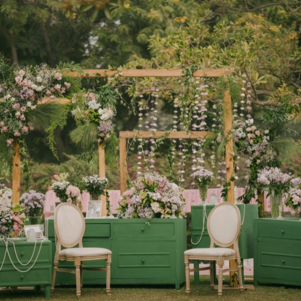 A vintage-inspired photobooth in greens and wood tones added character, styled with framed photographs, customised coasters, and thoughtful accents that felt deeply personal to the couple.