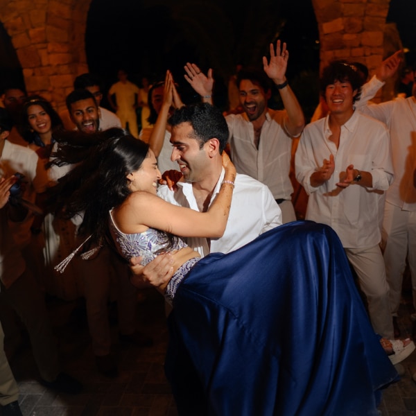 As dusk settled, the celebrations shifted to the Ambrosia Terrace for the sangeet. The space transformed into a twinkling dreamscape—fairy lights arched into a luminous canopy, and a custom projection of the couple’s initials lit up the Mykonos mountains behind the stage. The night unfurled in a series of lovingly choreographed performances by friends and family, punctuated by laughter, tears, and the kind of dancing that only happens when the vibe is right.