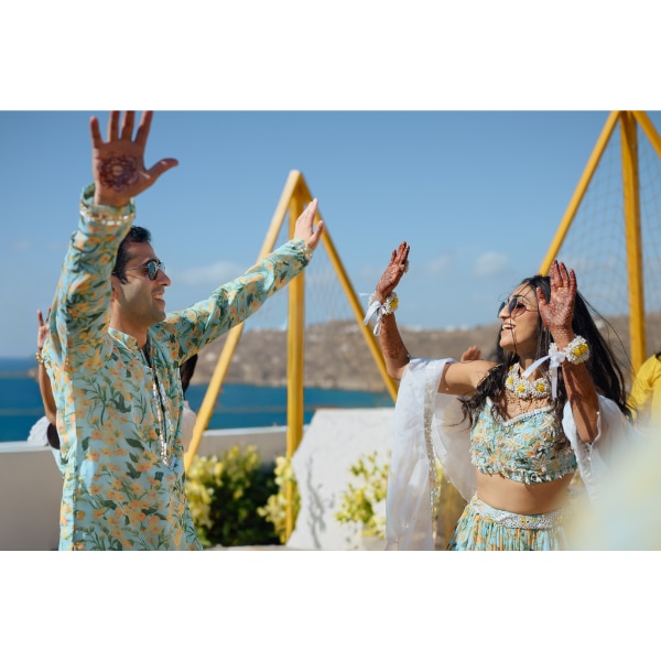 September 27 opened with a breezy haldi ceremony back at the Horizon Balcony. Soft marigold tones, natural textures, and the bright Mykonos sun created a warm and intimate setting.
