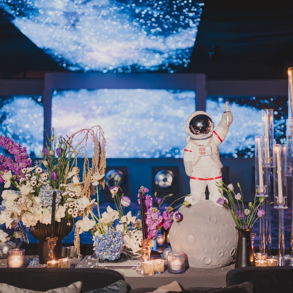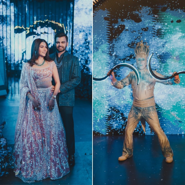 That evening, the couple’s personalities shone through in the sangeet, which celebrated Ashutosh’s fascination with outer space. Themed around his favourite film, Interstellar, the decor and entertainment transported guests into a galactic fantasy—complete with astronaut ice sculptures, surreal performers, and a sculpted logo luge that became the highlight of the bar.