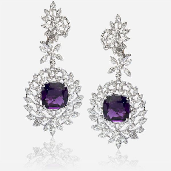 Dazzling white and a deep royal purple make for a contrastingly aesthetic duo with these statement earrings. Surrounded by floral clusters and leaf-cut diamonds, this pair is an apt ode to vintage luxury.