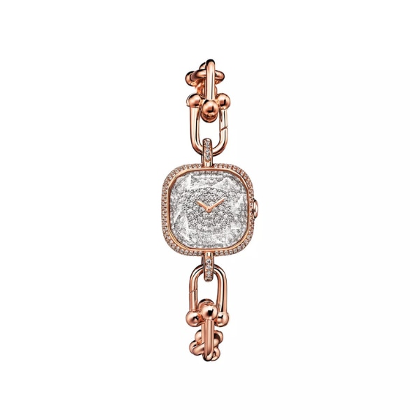 For the brides who love a powerful accessory, this one’s for you! With a dial featuring 125 pavé diamonds and an 18k rose gold band patterned in the iconic guage link design, this timepiece, crafted in Switzerland, is wearable elegance. Don’t miss the concealed clasp that lends to the overall sleek design.