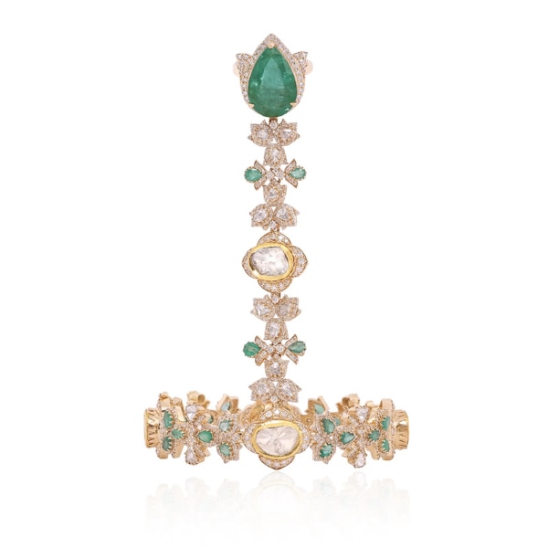 Over 13 carats of natural precious emeralds and 10 carats of round and polki diamonds amalgamate into this ornate haathphool. The desaturated emerald sheen works well with the uncut stones surrounding it, making for a striking visual.