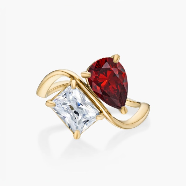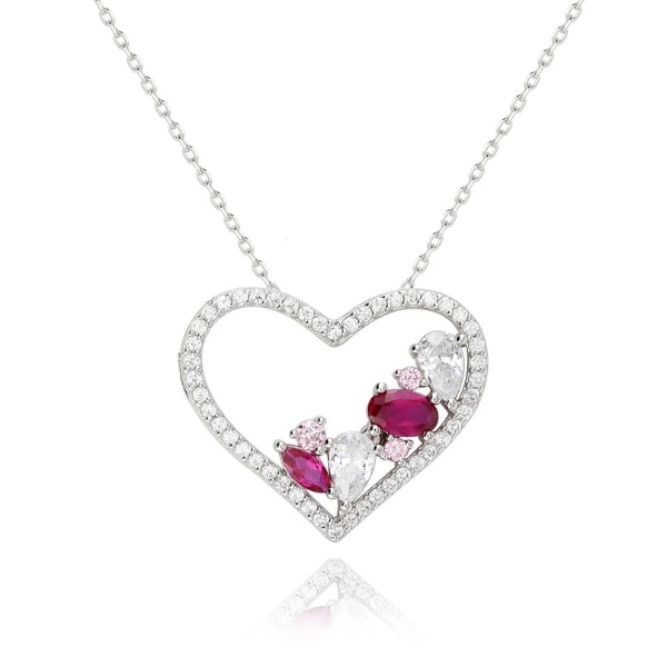 Multicut pear, marquise, and round shape cubic zirconias set in a pavé heart setting. Need we say more? Fiercely feminine, we’re rooting for ruby with this stunning piece, a masterclass in avant-garde design.