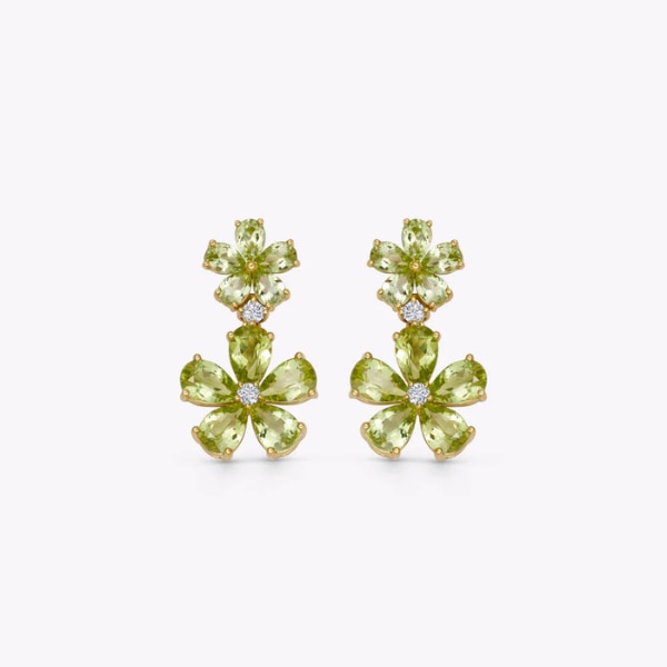 These peridot and diamond double flower earrings, crafted in 18ct yellow gold, are ornate, with just the right pop of a mild lime green offering delicate visual balance. Versatile across daily and occasion wear, this dazzling duo is the perfect bejelled accessory!