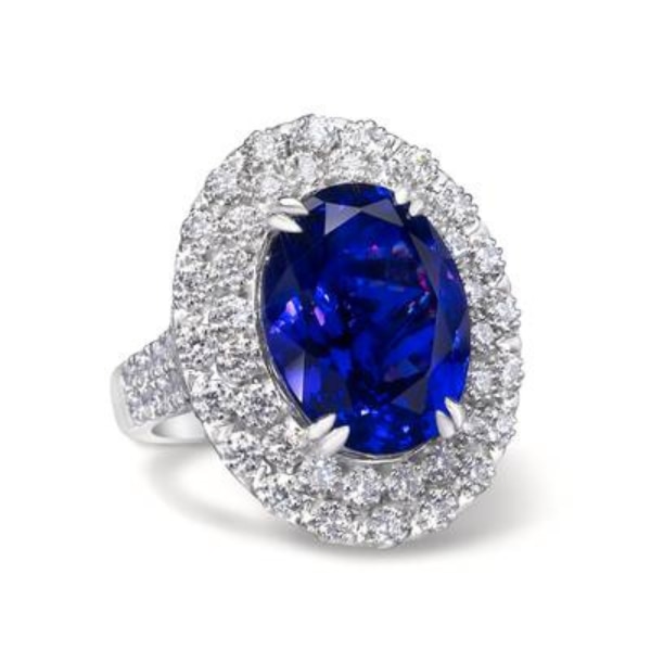 Only recently discovered in 1967, tanzanite is renowned for its vivid hue, high clarity and tri-chronic allure. Here, a blueberry tanzanite sits amidst a ring of diamonds, set in 18k vanilla gold, and we see the hype.